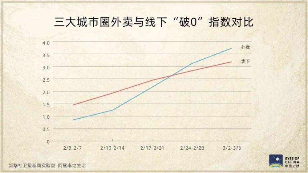 2月初,三大城市圈通過外賣恢復營業(yè)的商家數(shù)量少于線下恢復營業(yè)的數(shù)量。而到3月初,更多商家通過線上外賣服務恢復營業(yè)并獲得收入?!靶禄ā敝?“新服務”,在保障人民生活以及商業(yè)恢復的過程中發(fā)力明顯。