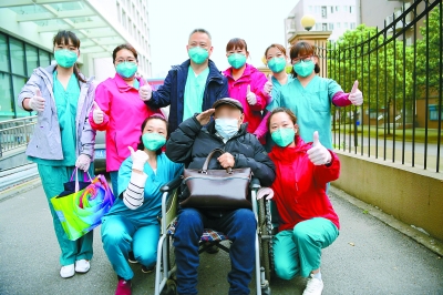 昨天上午,武漢協(xié)和醫(yī)院西院北京醫(yī)療隊負(fù)責(zé)的病區(qū)內(nèi),一名91歲的老兵孫爺爺康復(fù)出院,與平日里照料自己的醫(yī)護(hù)人員合影時,老兵敬了一個軍禮。記者 和冠欣攝