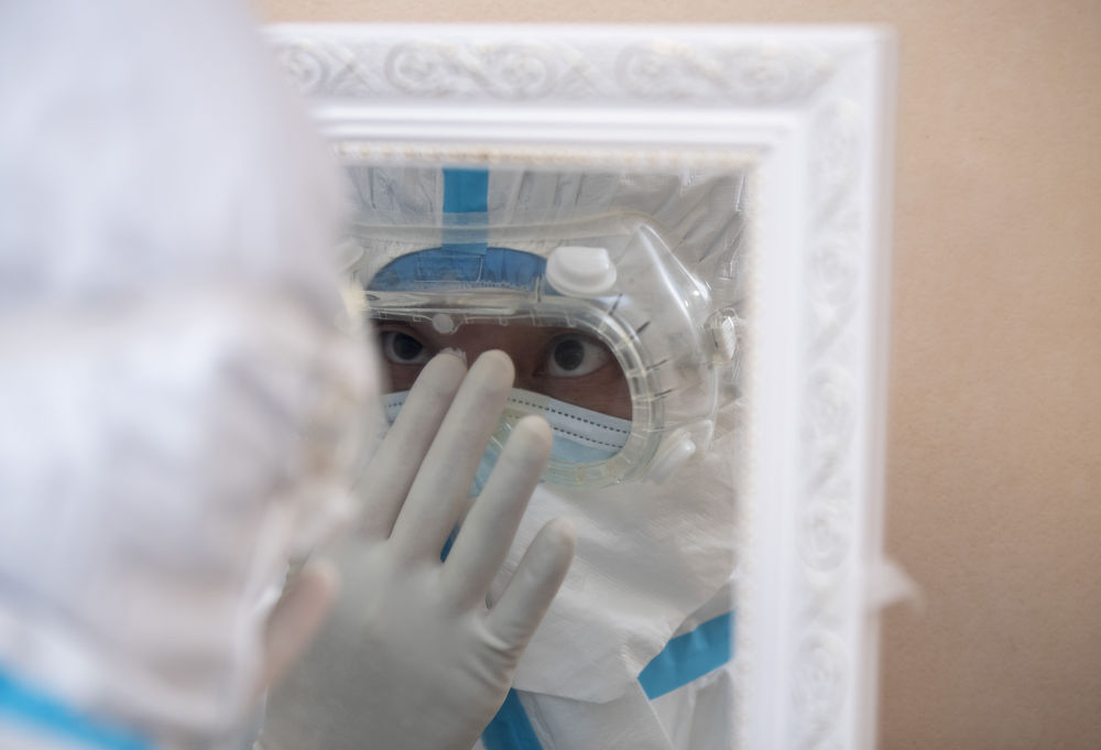 ↑3月13日晚,“擺渡人”小分隊隊員楊暉檢查護目鏡的佩戴情況。隊員的防護措施同重癥病房的醫(yī)生一樣,完成所有防護措施要經(jīng)過12個步驟。在華中科技大學同濟醫(yī)學院附屬同濟醫(yī)院光谷院區(qū),有很多生命“擺渡人”?!皵[渡人”日夜在醫(yī)院與醫(yī)院之間,留觀點與醫(yī)院之間穿梭不停,轉(zhuǎn)運新冠肺炎患者。