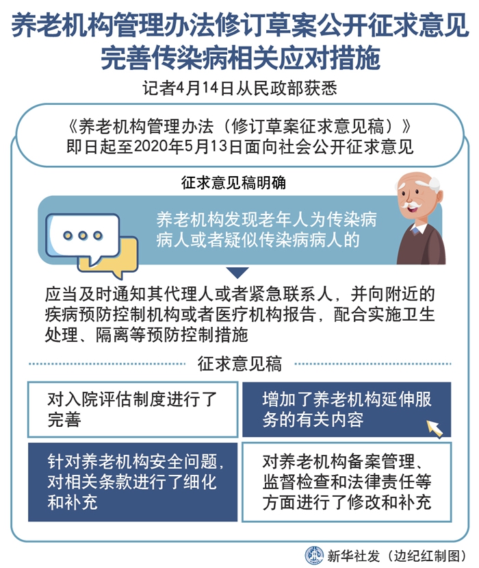 新華社北京4月14日電(記者孫少龍)記者14日從民政部獲悉,《養(yǎng)老機構管理辦法(修訂草案征求意見稿)》即日起至2020年5月13日面向社會公開征求意見,結合新冠肺炎疫情防控要求,征求意見稿依法完善了養(yǎng)老機構發(fā)現老年人為傳染病病人或者疑似傳染病病人時的應對措施。