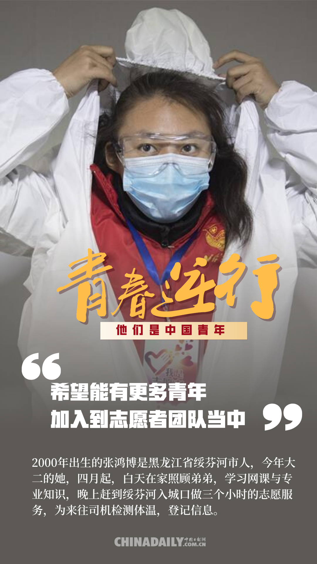 百年前,中國(guó)青年用春春和熱血,為祖國(guó)的前途命運(yùn)而抗?fàn)?;百年后,中?guó)青年秉承先輩精神,沖鋒在保衛(wèi)人民健康安全的戰(zhàn)疫前線。危機(jī)之時(shí),他們總是挺身而出,主動(dòng)申請(qǐng)到國(guó)家和人民最需要的地方去。在這場(chǎng)疫情防控阻擊戰(zhàn)中,4.2萬(wàn)多名援鄂醫(yī)護(hù)人員里有1.2萬(wàn)多名“90后”,還有一部分是“95后”“00后”,此外,在基建工人、公安干警、志愿者、網(wǎng)格員等抗“疫”隊(duì)伍里也有許多年輕的面孔,他們?cè)谝咔榉揽刂猩嵘?、迎難而上,為我們筑起了一道道鋼鐵長(zhǎng)城。這些人是當(dāng)代中國(guó)青年的縮影,他們用行動(dòng)證明,中國(guó)青年是堪當(dāng)大任的!