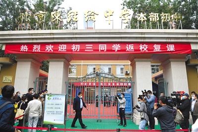 明日,北京8萬多名初三學生將正式復課。如何開展體育活動?出現(xiàn)突發(fā)事件如何進行處理?5月8日,記者對北京市朝陽區(qū)陳經(jīng)綸中學本部初中進行探訪。