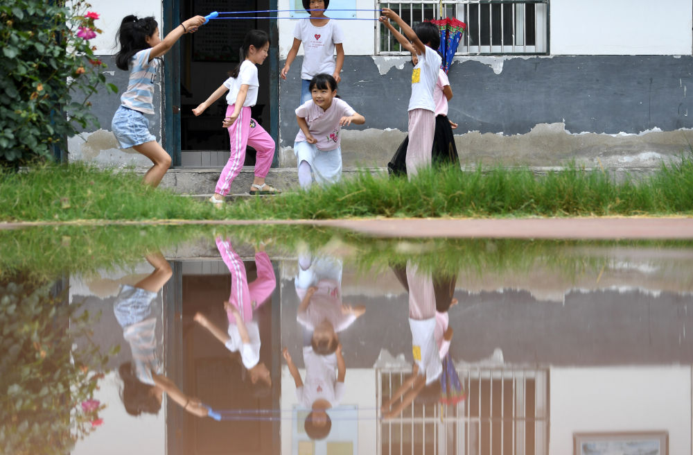 ↑?小思揚(前左三)在課間和同學一起玩耍。
