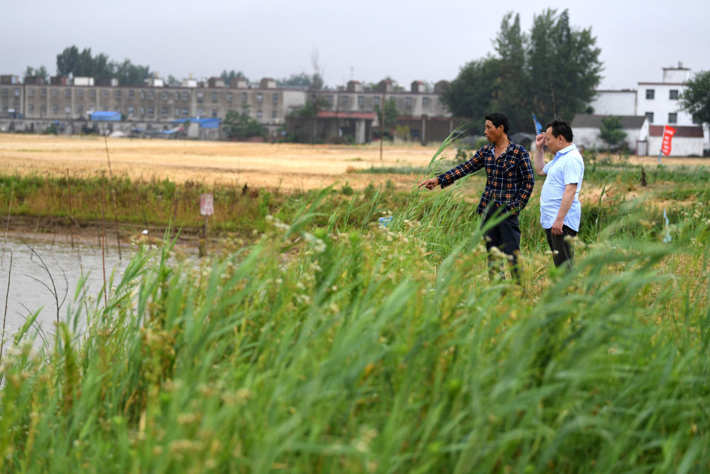 ↑?鄭加衛(wèi)(右)在了解汪李村貧困戶的魚塘養(yǎng)殖情況。