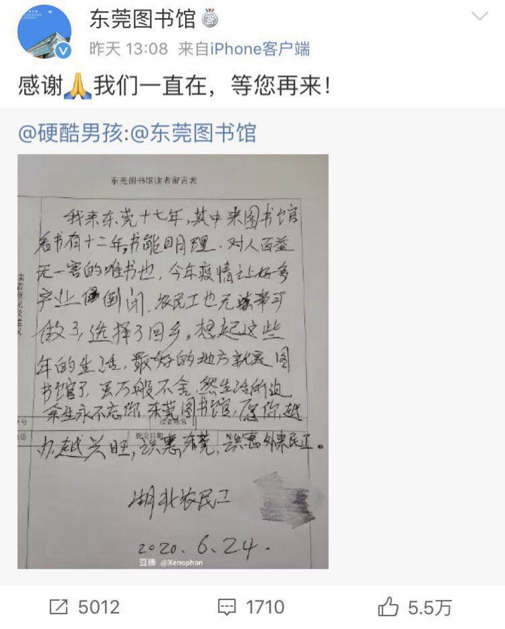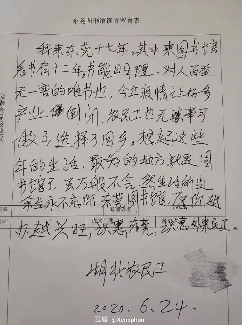 “我來東莞十七年,其中來圖書館看書有十二年。書能明理,對人百益無一害的唯書也。今年疫情讓好多產(chǎn)業(yè)(企業(yè))倒閉,農(nóng)民工也無事可做了,選擇了回鄉(xiāng)。想起這些年的生活,最好的地方就是圖書館了。雖萬般不舍,然生活所迫,余生永不忘你,東莞圖書館,愿你越辦越興旺。識惠東莞,識惠外來農(nóng)民工。”