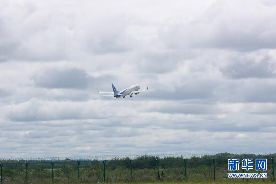 圖為8月6日在扎蘭屯成吉思汗機(jī)場起飛的河北航空公司波音737-800客機(jī)。新華網(wǎng)記者焦鵬 攝