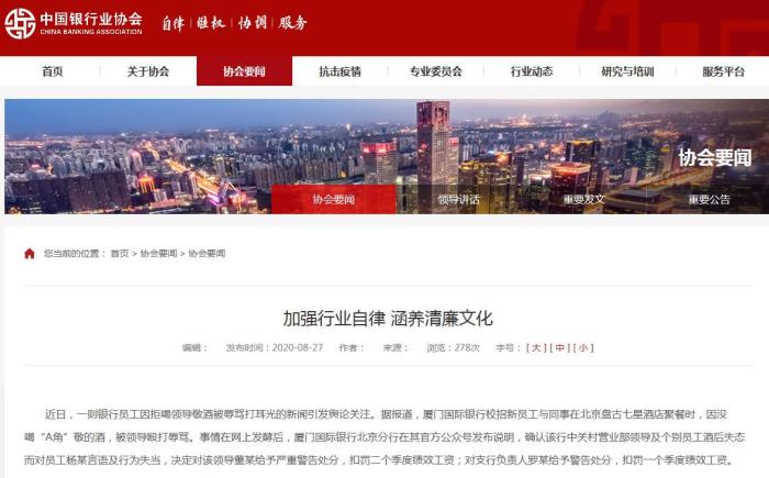 8月24日,廈門國際銀行北京分行發(fā)文證實此事并致歉。該行表示,員工楊某反映的中關村支行營業(yè)部某領導及該支行個別員工在私下非公款聚餐中,確系存在因酒后失態(tài)而對楊某做出言語及行為失當?shù)扰e動,上述行為確實對其本人造成了影響和傷害,對此深表歉意。