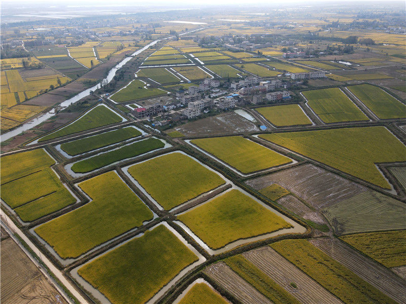 這是10月8日拍攝的安徽省潁上縣八里河鎮(zhèn)的稻田(無(wú)人機(jī)照片)。新華社記者 周牧 攝