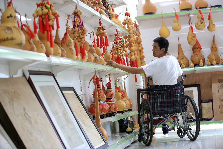 ????河北省邢臺(tái)市平鄉(xiāng)縣霍建龍,2014年因一起意外事故導(dǎo)致高位截癱。身殘志堅(jiān)的他學(xué)習(xí)烙畫葫蘆藝術(shù),實(shí)現(xiàn)脫貧致富,并創(chuàng)辦了殘疾人烙畫葫蘆社,帶領(lǐng)其他殘疾貧困群眾脫貧致富。圖為霍建龍整理葫蘆作品。 柴更利 攝