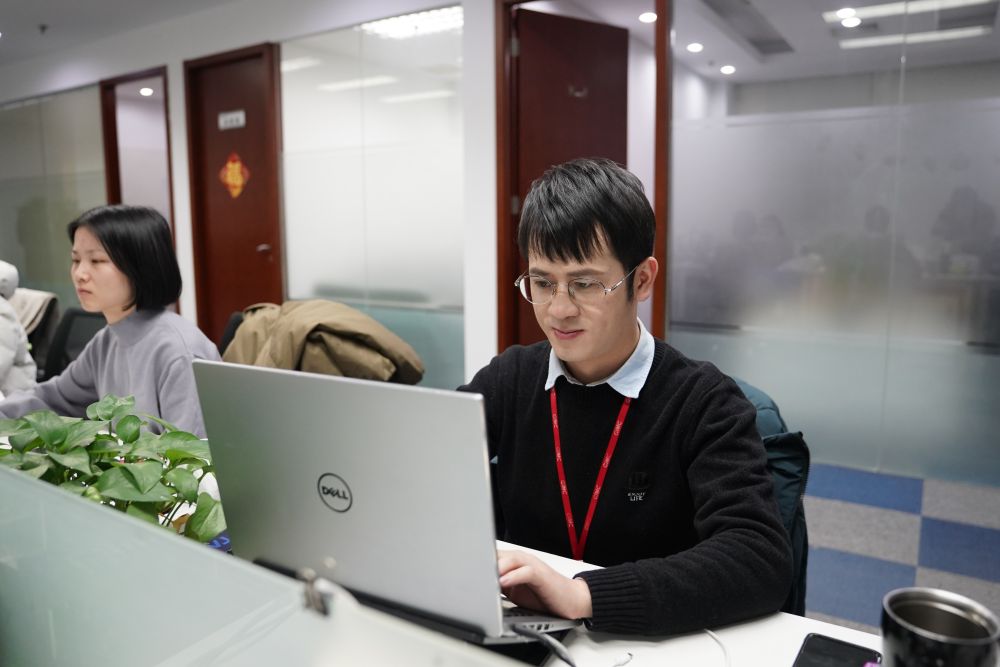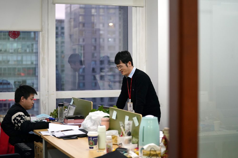 ??12月16日,在廣東省廣告集團股份有限公司第二事業(yè)群北京中心,陳安心(右)在辦公室內(nèi)工作。