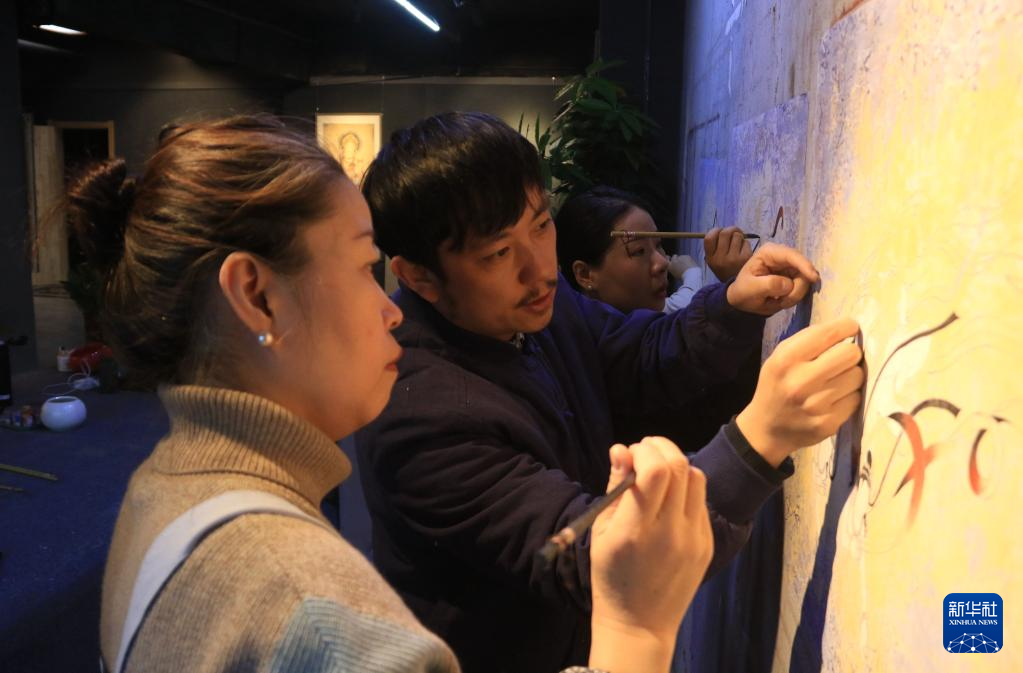 2月22日,在敦煌小镇鸣沙书院,艺术工作者张杰龙(中)指导学员临摹敦煌壁画。