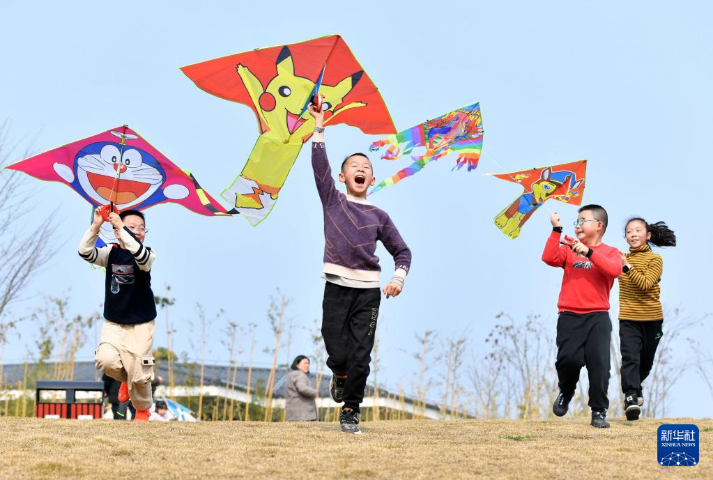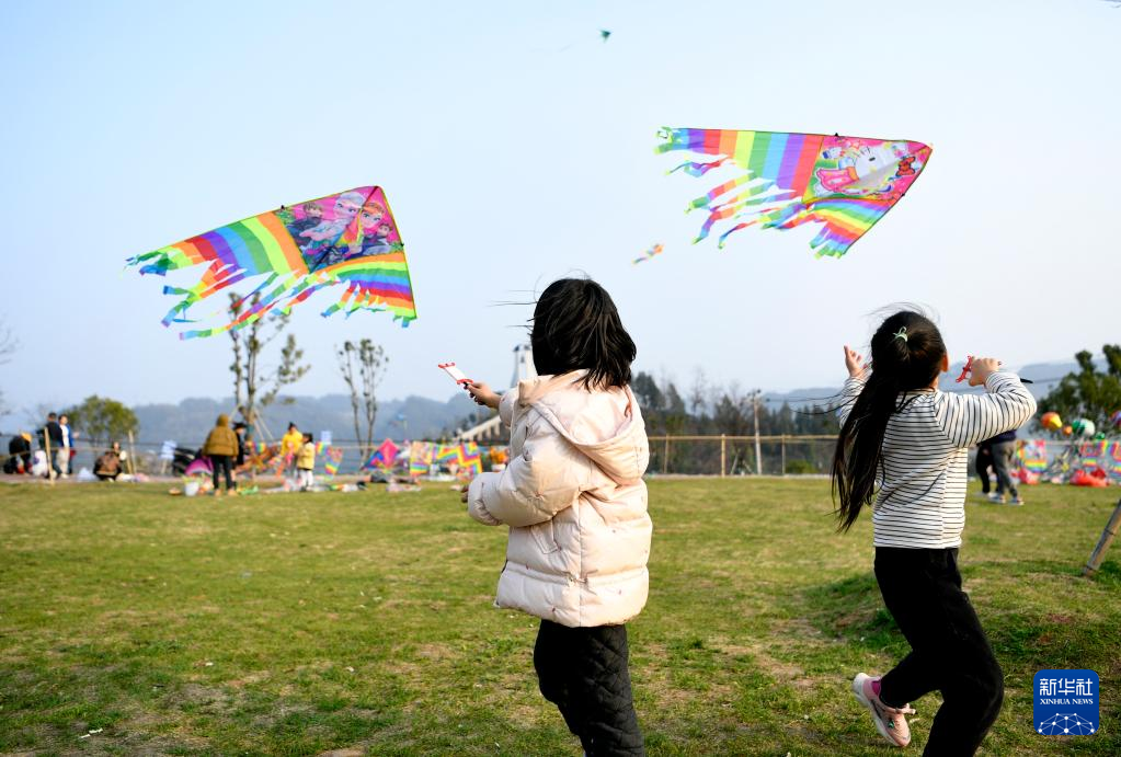 春光明媚,人们踏青出游,放飞风筝,乐享春日美好时光。