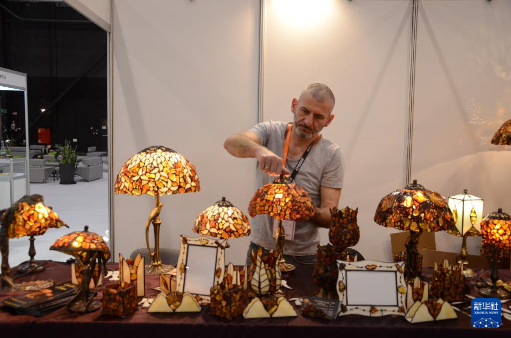 3月25日,工作人员在波兰格但斯克的国际琥珀珠宝展销会上调试琥珀台灯。