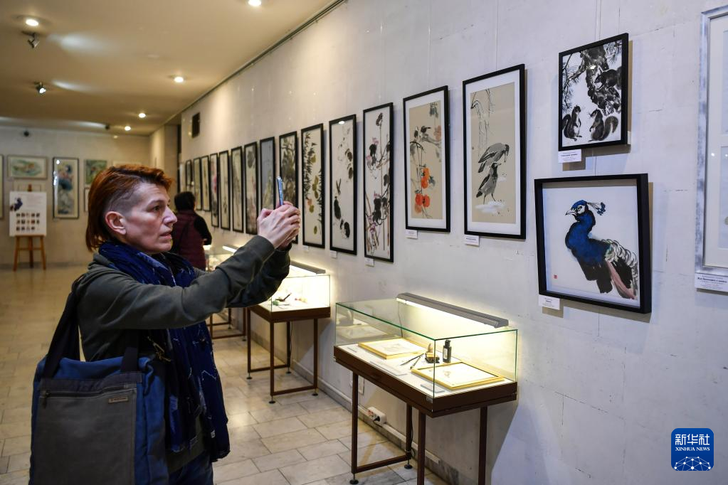 3月30日,人们在俄罗斯莫斯科达尔文博物馆参观中国画和绘画工具。