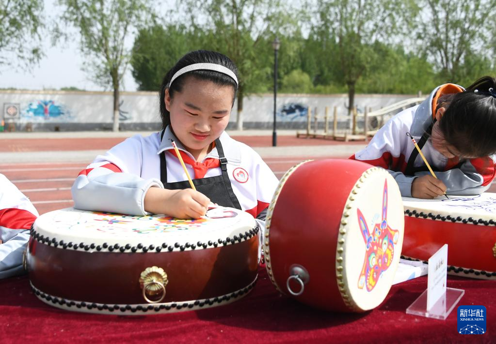 4月19日,门楼中心小学的学生在活动中绘制鼓面。