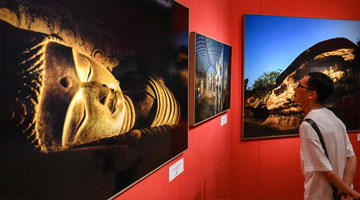 参观者在西安半坡博物馆里观看彩陶盆(8月9日摄)。