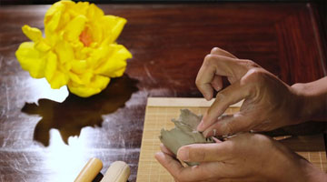 研学学生在西安半坡博物馆里制作陶埙(8月9日摄)。