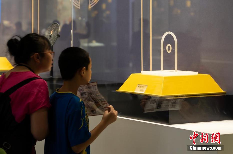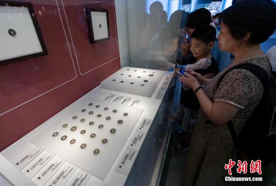 观众被展出的唐代无字通宝铜钱、宋代牛纹铜币等吸引。泱波 摄