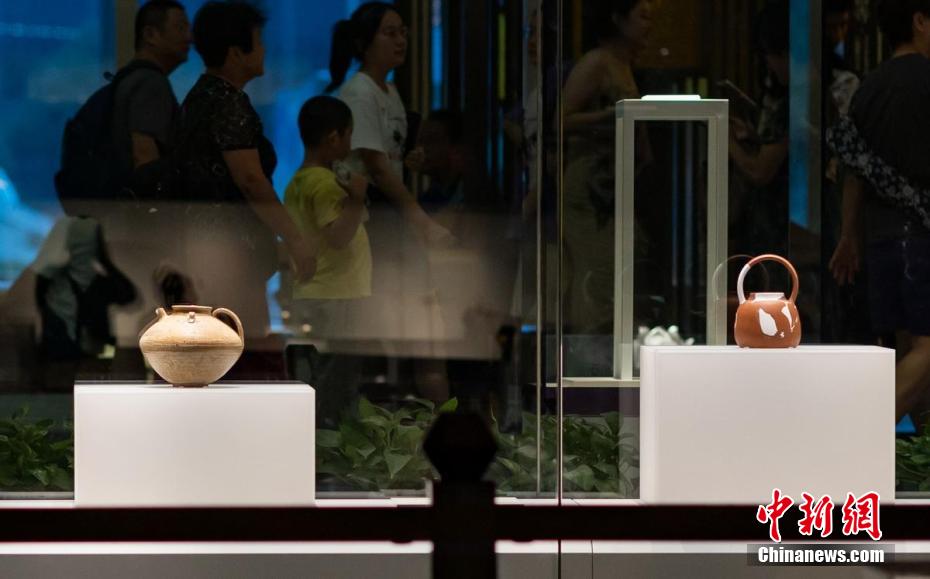 大报恩寺遗址博物馆展出的五代时期青釉瓷执壶(左)、清代紫砂提梁壶(右)。泱波 摄