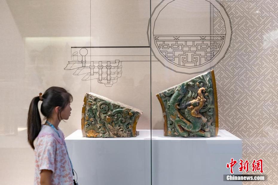 小观众参观展出的明代彩釉龙纹琉璃砖。泱波 摄