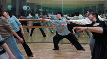 4月8日晚,在上海市群众艺术馆,舞蹈课程的老师在给夜校学员们上课。