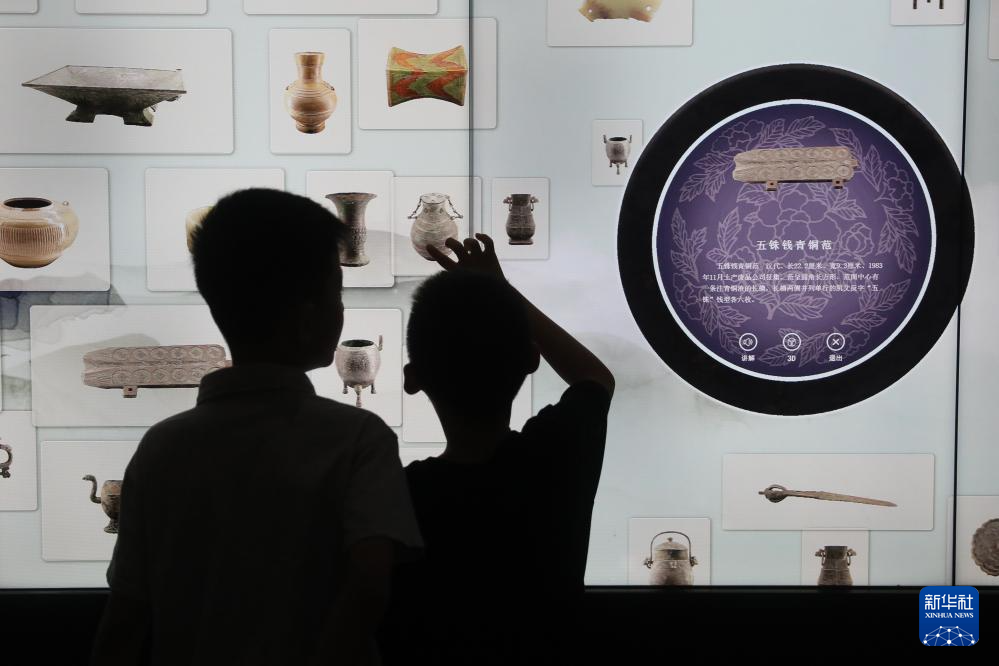 5月18日,小朋友在山东省滕州博物馆体验文物数字化展示。