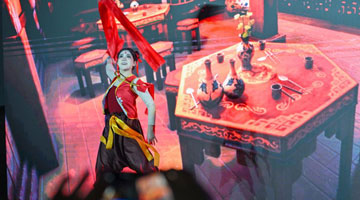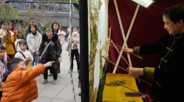 3月19日,一名参观者在姜庄镇用手机拍摄泥老虎产品。