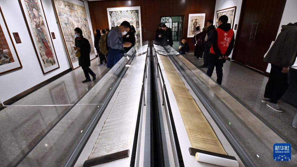 3月29日,观众在参观“如是莫高”敦煌艺术大展中展出的复制的敦煌出土的经卷等文物。