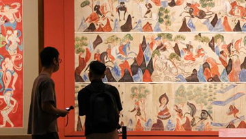 8月16日,观众在鄂尔多斯市博物院观赏建造于北齐的彩绘石雕菩萨像。