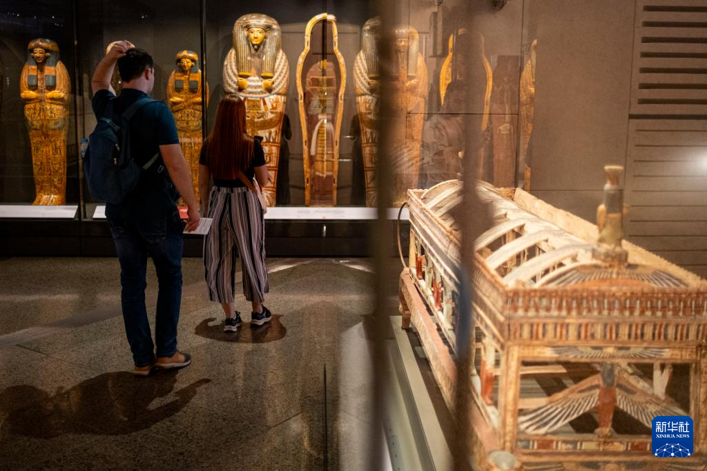 12月20日,游客在埃及吉萨的大埃及博物馆观赏法老图坦卡蒙的黄金内棺。