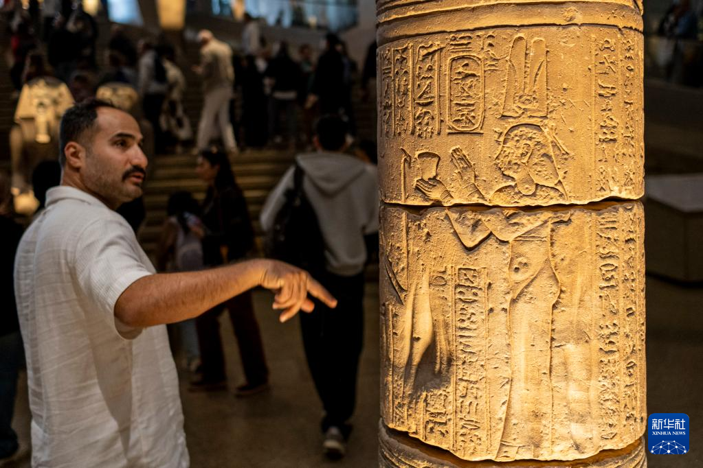 12月20日,游客在埃及吉萨的大埃及博物馆观赏纪念国王托勒密九世的石柱。