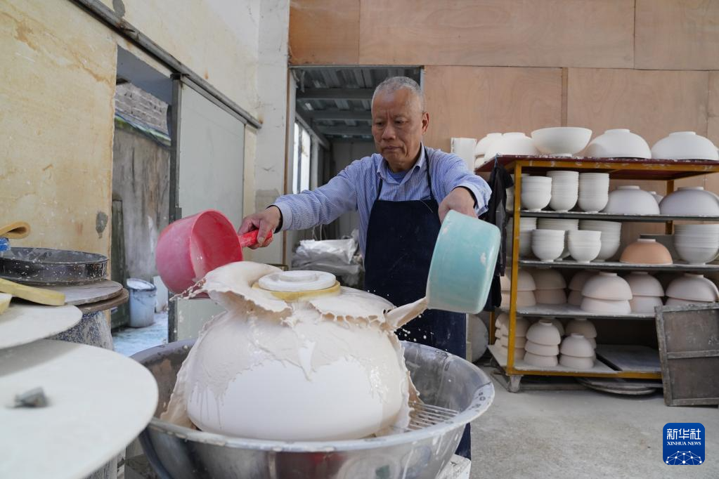 卢建德在给薄胎瓷碗上釉(3月10日摄)。