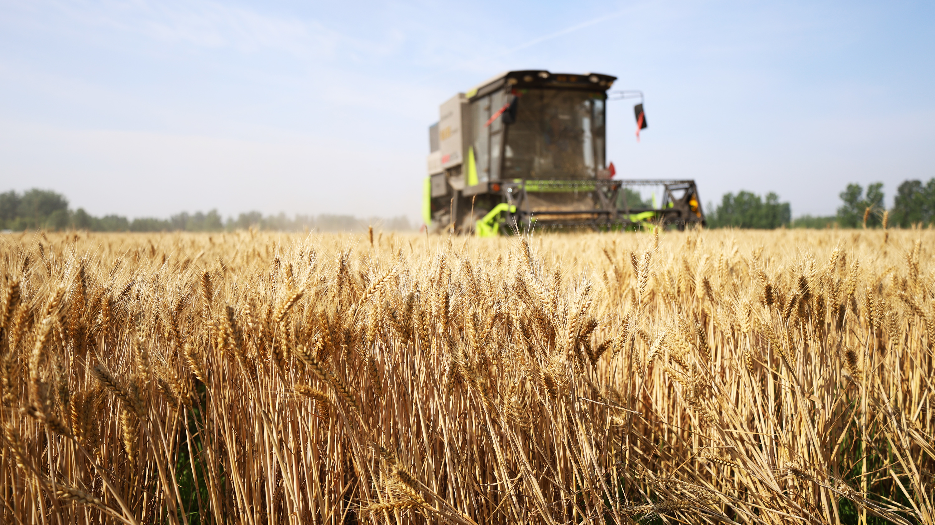 6月7日,收割机在山东省临沂市郯城县郯城街道田间收割小麦 新华社发(张春雷 摄)