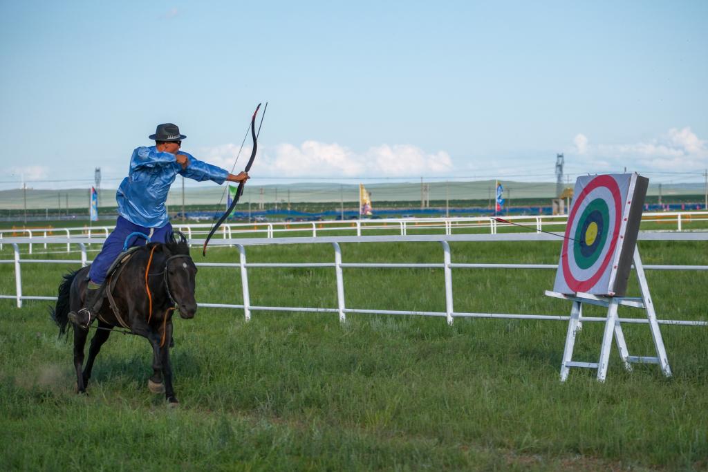 2025年7月20日,内蒙古自治区第35届草原那达慕“男儿三艺”比赛在内蒙古锡林郭勒盟锡林浩特市举行。“男儿三艺”包括赛马、搏克和射箭,是每年那达慕上的固定比赛项目。新华社记者 马金瑞 摄