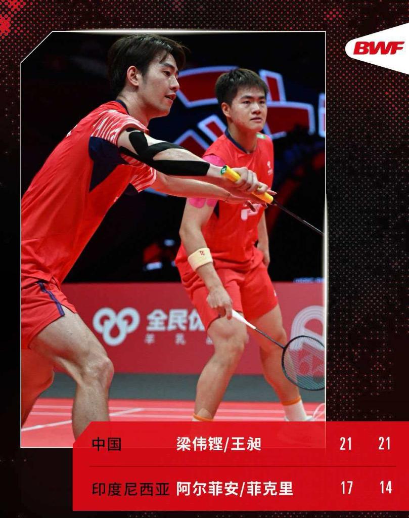 国羽男双“独苗”梁伟铿/王昶以21:17、21:14击败印度尼西亚强手阿尔菲安/菲克里,小组赛首场失利后连胜两场,抢得一个出线名额。赛后王昶说近两个月没参加国际比赛了,正在通过小组赛慢慢恢复状态。