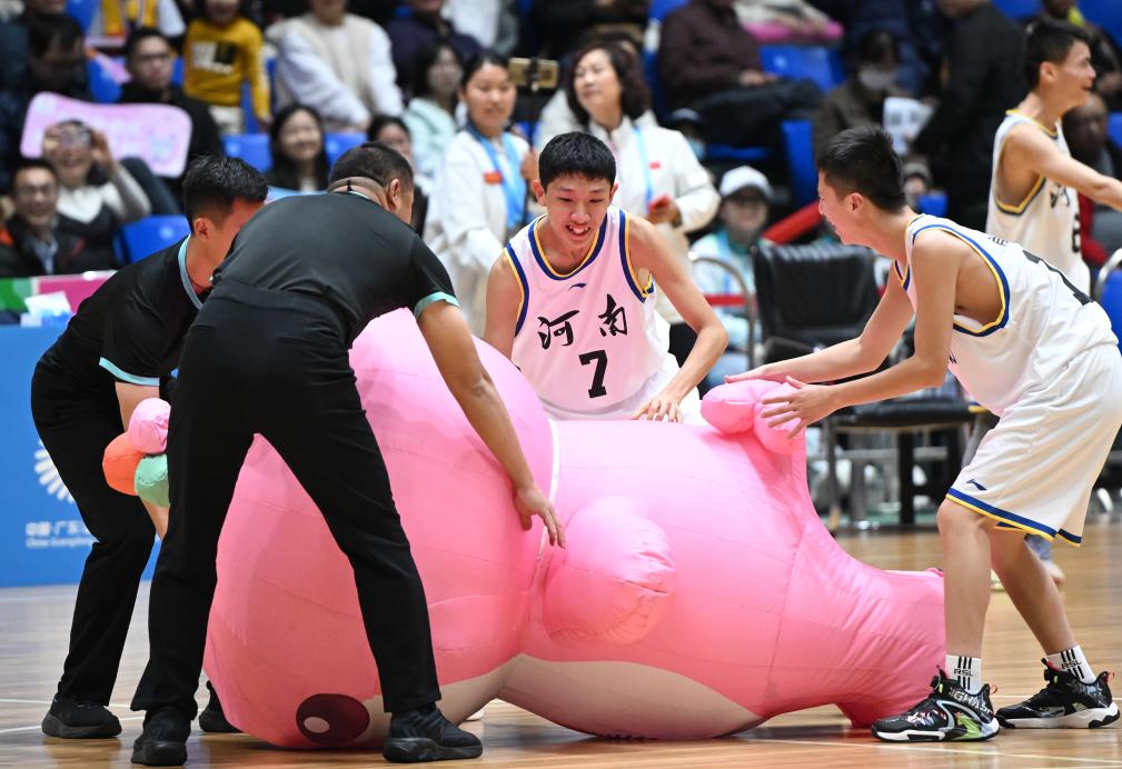 12月14日,河南队球员在比赛间隙和吉祥物“乐融融”互动。新华社记者 邓华 摄