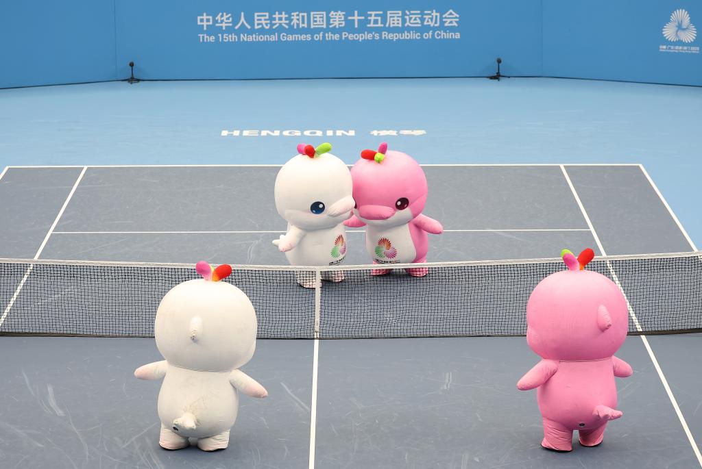 11月12日,第十五届全国运动会吉祥物“喜洋洋”“乐融融”在网球比赛间隙表演。新华社记者 张晨霖 摄