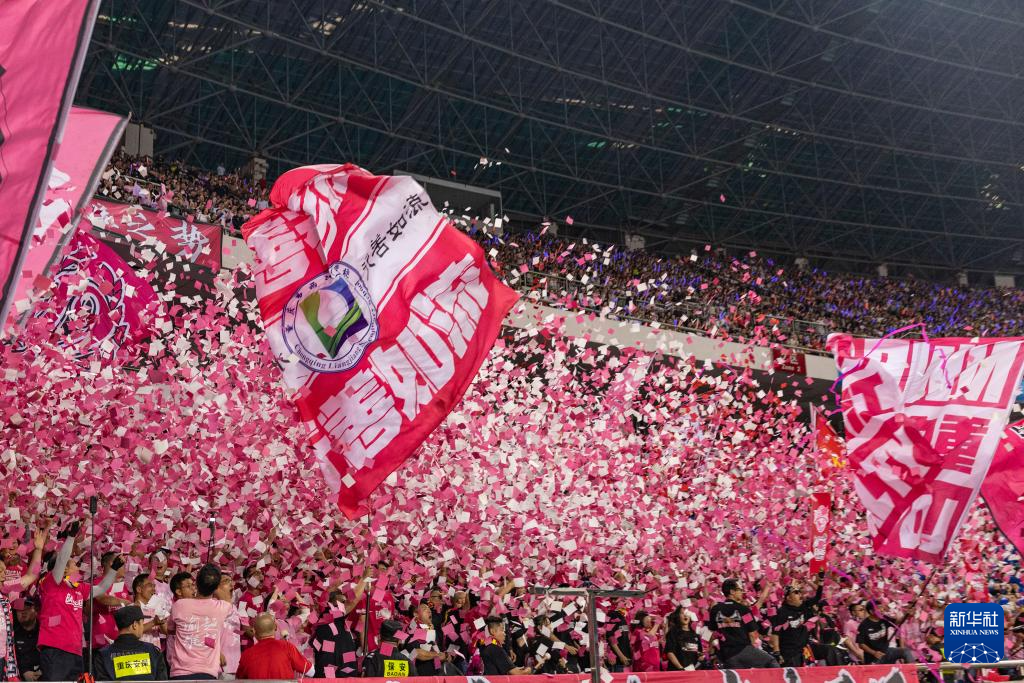 4月12日,两江临空队球迷在开赛前为球队加油。