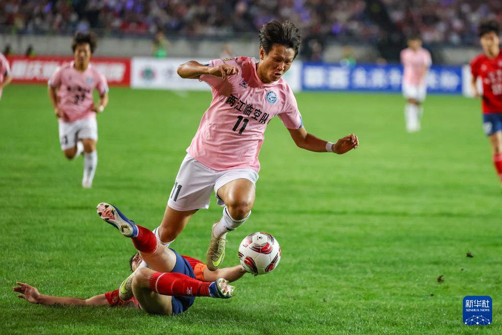 4月12日,两江临空队球员谢杰(左)在比赛中射门。