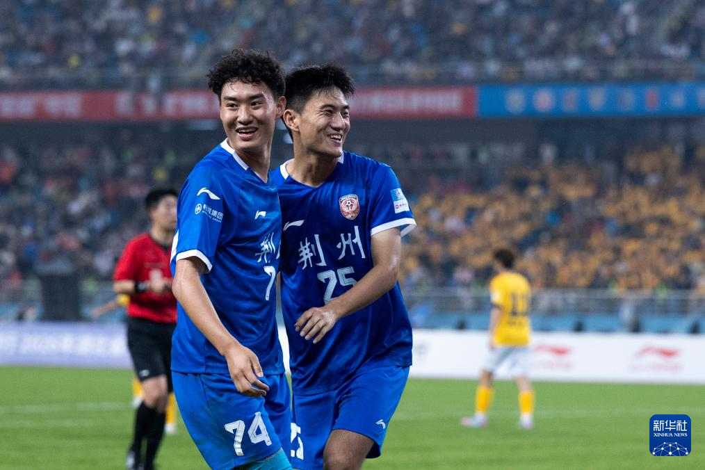 4月12日,荆州恒隆队球员吴文浩(左)和尼昂在队友进球后庆祝。