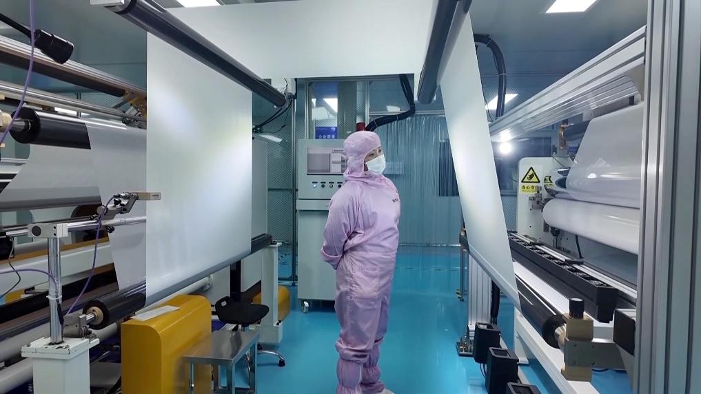 在园区内的湖南壹鑫科技有限公司无尘生产车间,光学薄膜自动化生产线正满负荷运转。