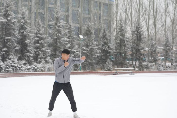 天微亮,田徑場上已鋪滿積雪。跑道中央站著一名身著灰色運(yùn)動(dòng)服的小伙兒,只見他向空氣中揮出一拳又一拳,地上也留下了一圈圈腳印……