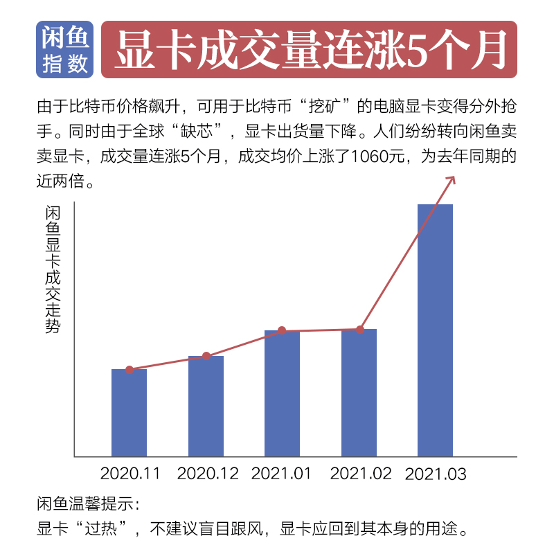 ????? 根據(jù)閑魚(yú)平臺(tái)數(shù)據(jù)顯示,顯卡成交呈現(xiàn)明顯的“量?jī)r(jià)齊升”現(xiàn)象。閑魚(yú)平臺(tái)上顯卡的成交量已經(jīng)連漲5個(gè)月,僅在今年第一季度,顯卡成交量同比增長(zhǎng)了338%,3月份更是呈飆升走勢(shì)。對(duì)此,平臺(tái)將設(shè)置“冷靜期”進(jìn)行降溫處理,并呼吁用戶(hù)理性購(gòu)買(mǎi)。