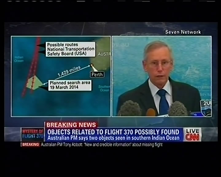 ??? 澳方稱在印度洋中發(fā)現(xiàn)了可能與馬航失聯(lián)客機(jī)有關(guān)物體這張3月20日拍攝的CNN視頻截圖顯示,澳大利亞海事安全局官員在堪培拉召開的新聞發(fā)布會(huì)上發(fā)言。澳大利亞總理阿博特當(dāng)日在議會(huì)說,澳方在印度洋中發(fā)現(xiàn)了可能與馬航失聯(lián)客機(jī)有關(guān)的兩個(gè)物體。澳大利亞海事安全局官員當(dāng)日說,發(fā)現(xiàn)可疑碎片的位置與之前確定的馬航失聯(lián)客機(jī)南部搜尋航道高度吻合,但當(dāng)?shù)睾S蛩沫h(huán)境非常差。新華社發(fā)
