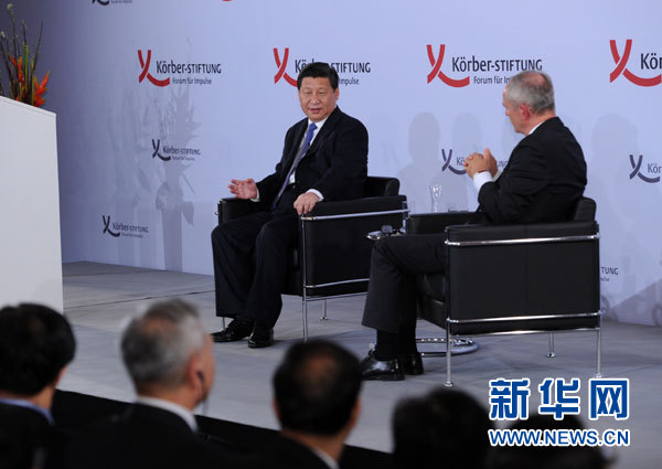 ??? 這是演講結(jié)束后習(xí)近平主席回答科爾伯基金會(huì)常務(wù)副主席魏邁爾的提問。新華社記者 饒愛民 攝