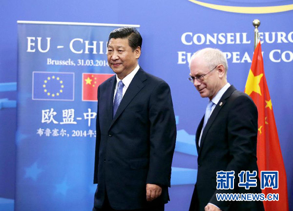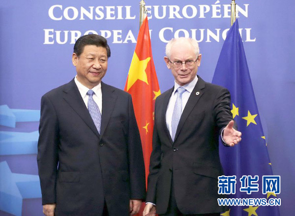 ????新華網(wǎng)布魯塞爾3月31日電(記者 魏建華 錢彤)國(guó)家主席習(xí)近平31日在布魯塞爾同歐洲理事會(huì)主席范龍佩舉行會(huì)談。雙方就新形勢(shì)下深化中歐全面戰(zhàn)略伙伴關(guān)系廣泛深入交換意見,達(dá)成重要共識(shí)。習(xí)近平強(qiáng)調(diào),要從戰(zhàn)略高度看待中歐關(guān)系,將中歐兩大力量、兩大市場(chǎng)、兩大文明結(jié)合起來,共同打造中歐和平、增長(zhǎng)、改革、文明四大伙伴關(guān)系,為中歐合作注入新動(dòng)力,為世界發(fā)展繁榮作出更大貢獻(xiàn)。
