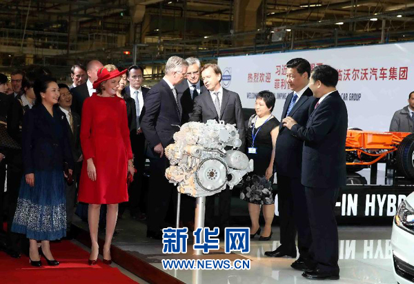 ????習(xí)近平和夫人彭麗媛、菲利普國(guó)王和瑪?shù)贍柕峦鹾笠煌哌M(jìn)生產(chǎn)車間,參觀汽車展示和生產(chǎn)線,受到當(dāng)?shù)貑T工的熱情歡迎。企業(yè)負(fù)責(zé)人向習(xí)近平介紹汽車研發(fā)、生產(chǎn)和銷售情況。習(xí)近平和菲利普國(guó)王共同為公司出口中國(guó)的第30萬(wàn)輛汽車揭幕。