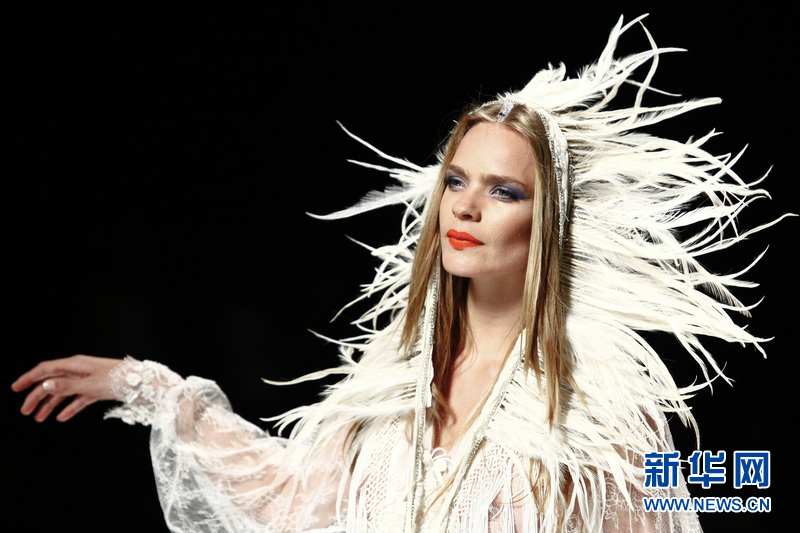 模特在T臺上展示西班牙品牌Yolan Cris的婚紗。Yolan Cris品牌由Yolanda和Cristina姐妹聯(lián)手打造,同時(shí)這也是來自巴塞羅那當(dāng)?shù)氐囊粋€婚紗品牌。