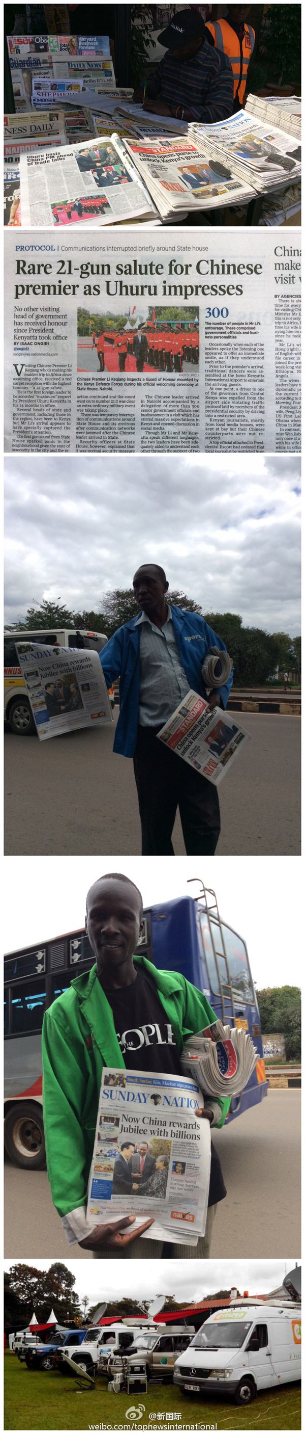 ????新華網(wǎng)北京5月11日電? 據(jù)新華社“新國際”微博報道,連日來,肯尼亞各大媒體紛紛對李克強總理訪肯進行全方位報道。主要報紙均在頭版頭條大篇幅介紹訪問情況,并開辟專版引述李總理講話對肯中關系進行述評??先箅娨暸_現(xiàn)場直播李總理和肯雅塔總統(tǒng)會見記者實況??厦襟w還高度評價中國在文化教育等領域的軟實力外交。
