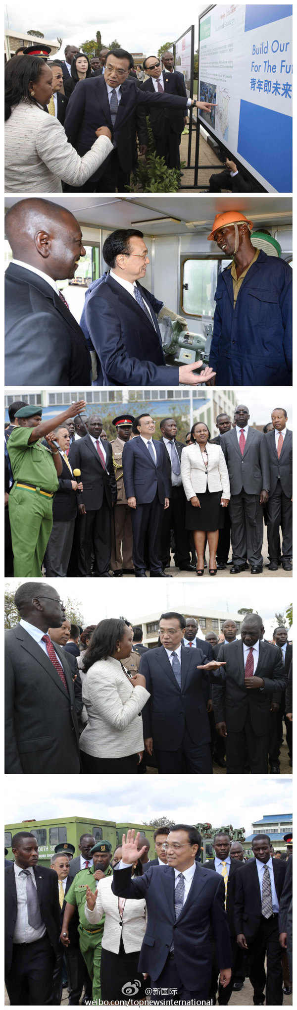 ????新華網(wǎng)北京5月11日電 據(jù)新華社“新國(guó)際”微博報(bào)道,李克強(qiáng)總理11日在肯副總統(tǒng)魯托陪同下到國(guó)家青年服務(wù)隊(duì)參觀。這里供學(xué)員實(shí)習(xí)的鉆井、起重、消防等裝備不少來(lái)自中國(guó)。李克強(qiáng)攀上一輛移動(dòng)維修車查看并詢問(wèn)維護(hù)等服務(wù)情況。他說(shuō),要用好中國(guó)裝備和技術(shù)優(yōu)勢(shì),幫助非洲青年提升職業(yè)技能,促進(jìn)當(dāng)?shù)鼐蜆I(yè)。?
